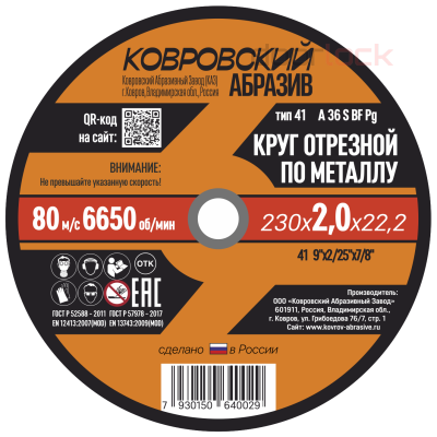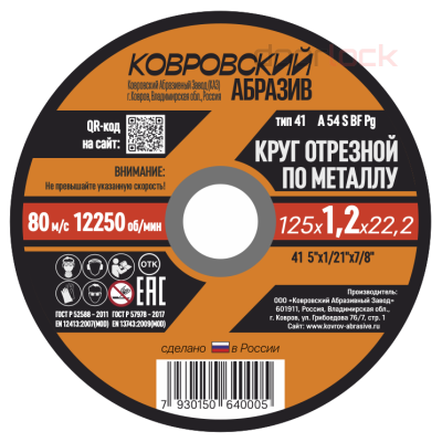 Круг отрезной по металлу тип-41 "Ковровский Абразив"